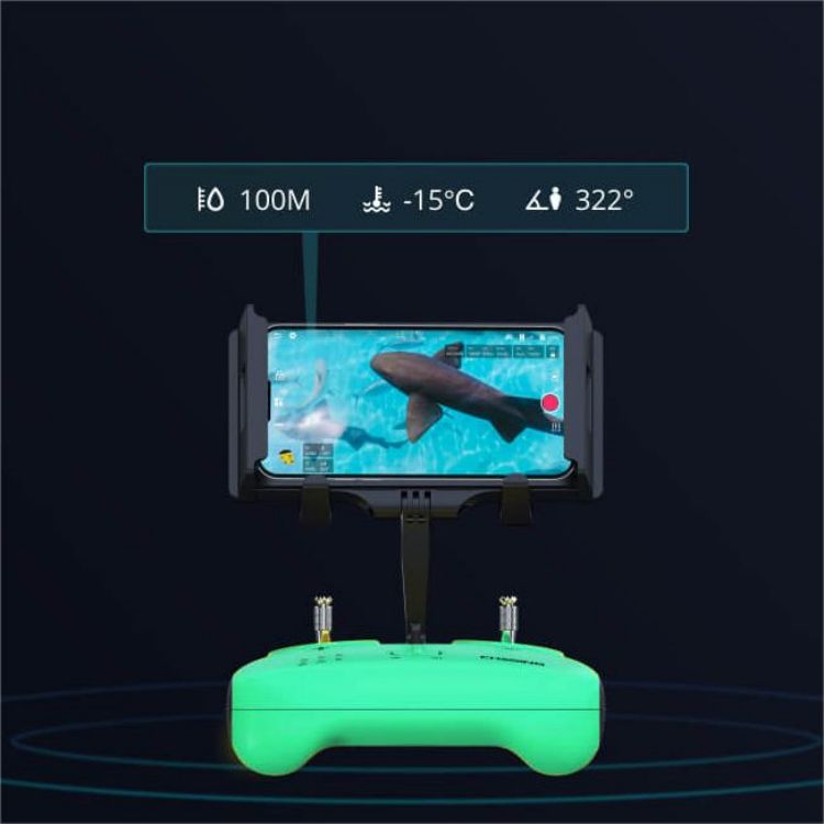 7. 智能5驱,精准悬停,一键定深,可调倾斜模式,多角度捕捉水下影像:采用智能控制算法,实现机器在水中0~100米任意深度悬停定深拍摄,可实现机器±45°俯仰拍摄和360°自由旋转,并在水中任何深度自动定深,精准悬停,灵活性更强,捕捉更丰富的水下影像。