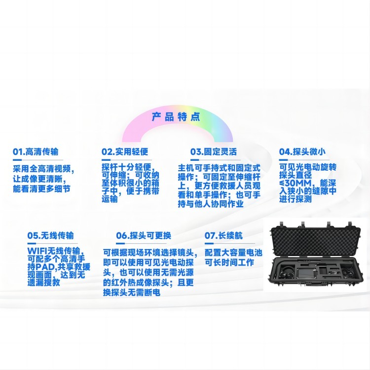 无线传输:WIFI无线传输,可配多个高清手持PAD,共享救援现画面,达到无遗漏搜救